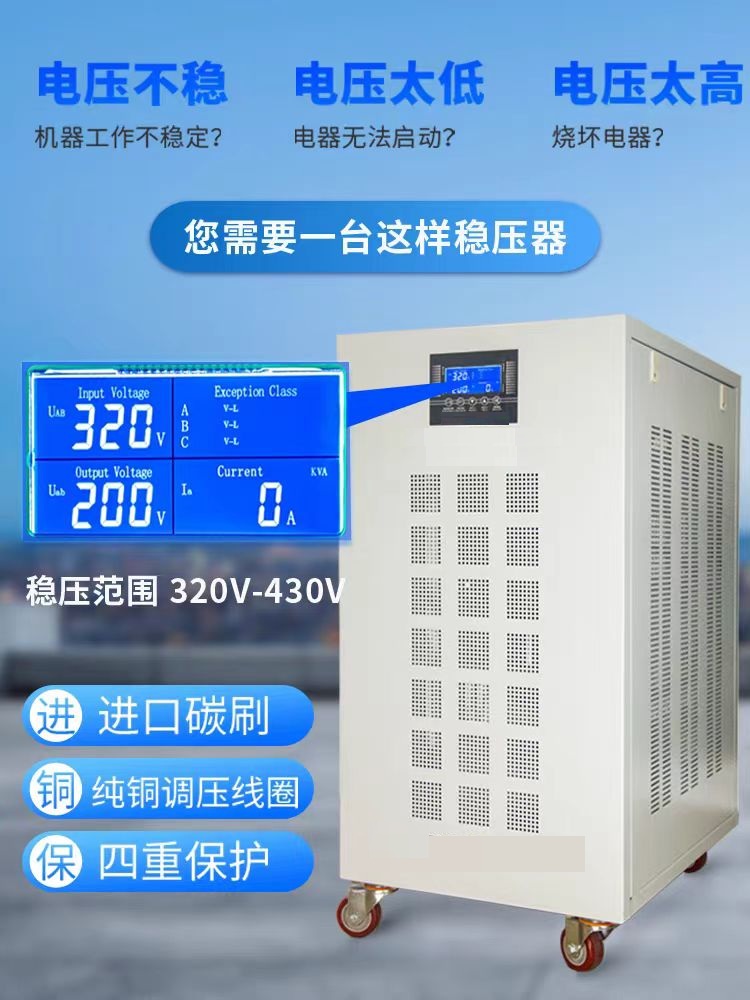 Brief introduction:SBW-SJ series three-phase AC automatic voltage regulator is based on the perfect combination of traditional compensated AC voltage regulator and modern intelligent control technology, so that users can enjoy the reliability and convenience of parameter setting and maintenance brought by modern control circuits, highlighting the safety, economy, stability, energy saving and humanization of the man-machine interface of the voltage regulator equipment. This voltage regulator power supply can be equ